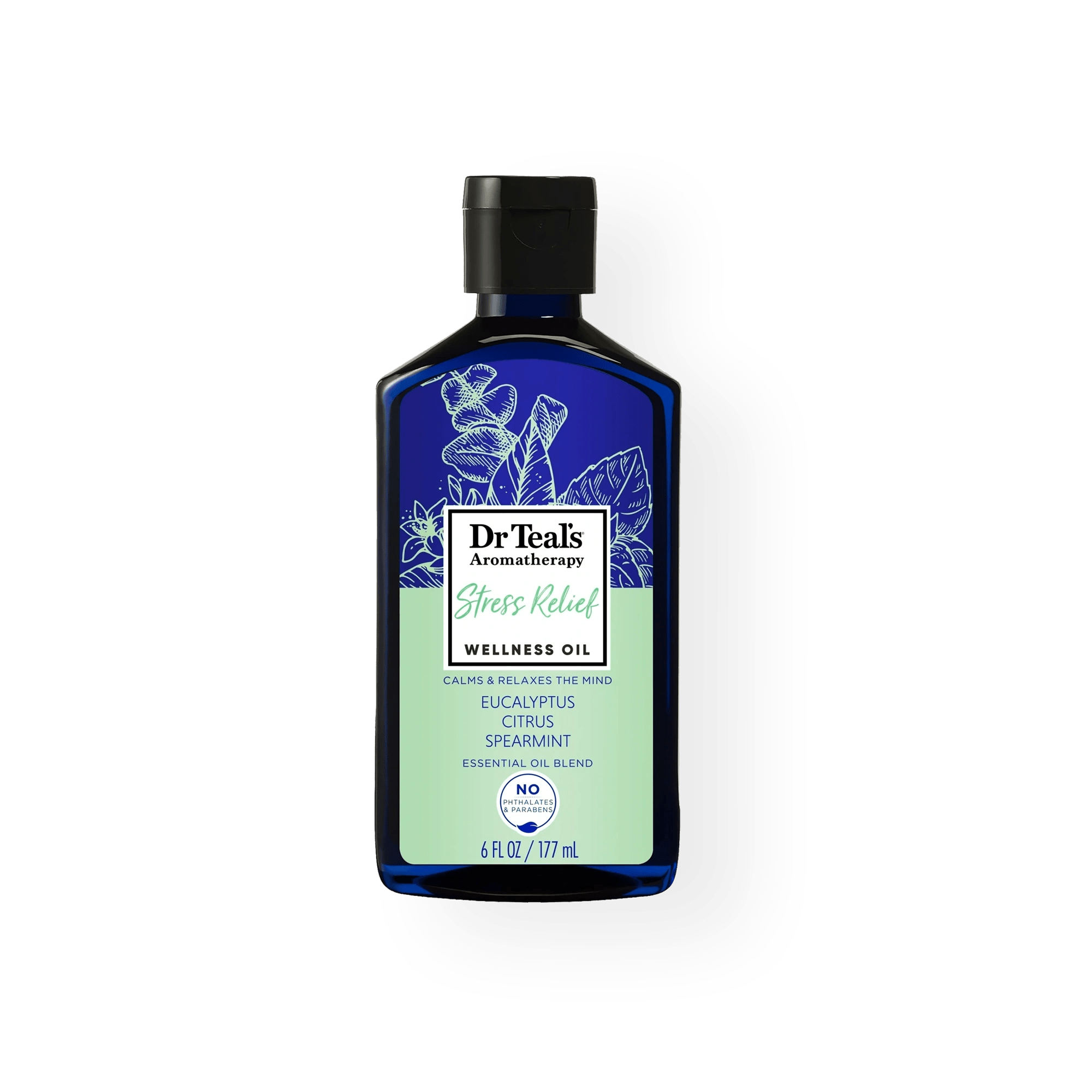 Dr Teal's Aromatherapy Stress Relief Wellness Oil, Eucalyptus, Citrus & Spearmint. Formulated with sweet almond oil, cocoa butter, and jojoba oil, this gentle and lightweight formula absorbs quickly to moisturize your skin and help you wind down after a long day. The soothing blend of eucalyptus, citrus, and spearmint essential oils helps relax and calm the mind. Simply massage and smooth all over your skin for fast hydration. Dr Teal's Aromatherapy Stress Relief Wellness Oil, Eucalyptus, Citrus & Spearmint is paraben-free, phthalate-free, cruelty-free, and vegan. Pair with other items from the Dr Teal's Aromatherapy Stress Relief line to help enhance your winddown routine.