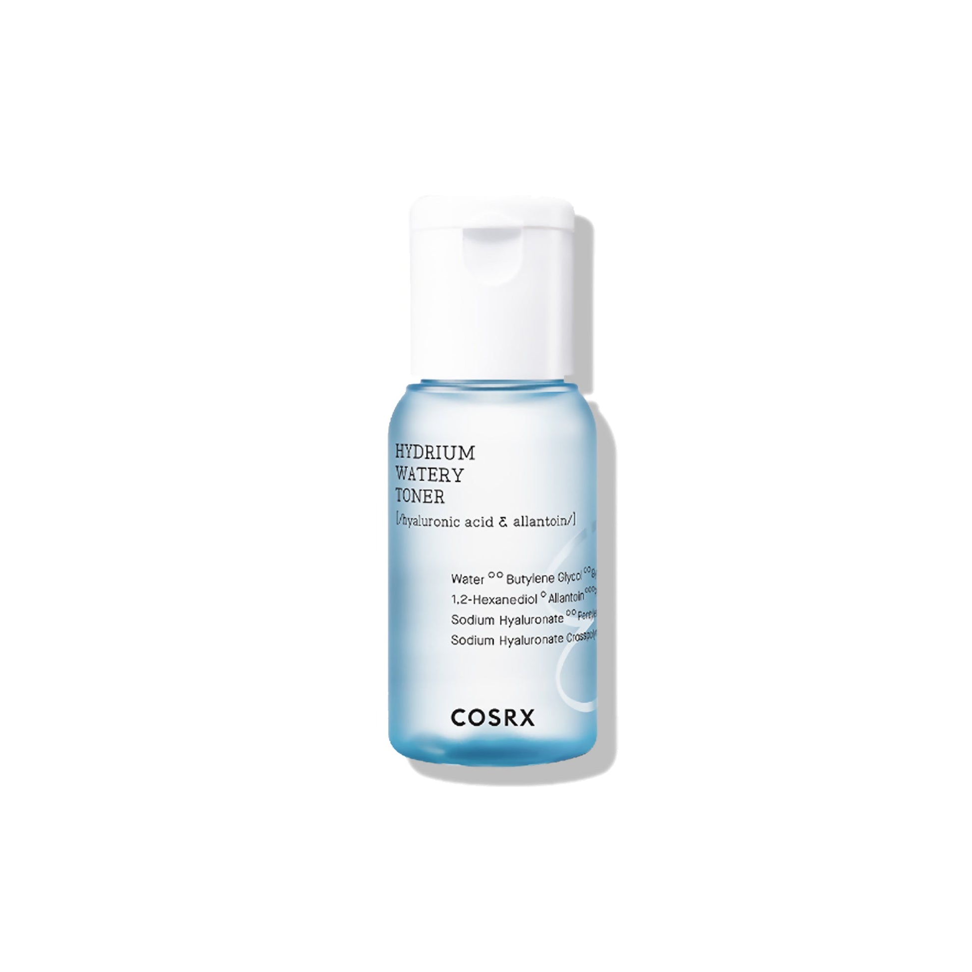 - Hydrium Watery Toner Mini: A travel-friendly burst of hydration. This refreshing toner quickly balances your skin’s pH and prepares it to absorb subsequent treatments.